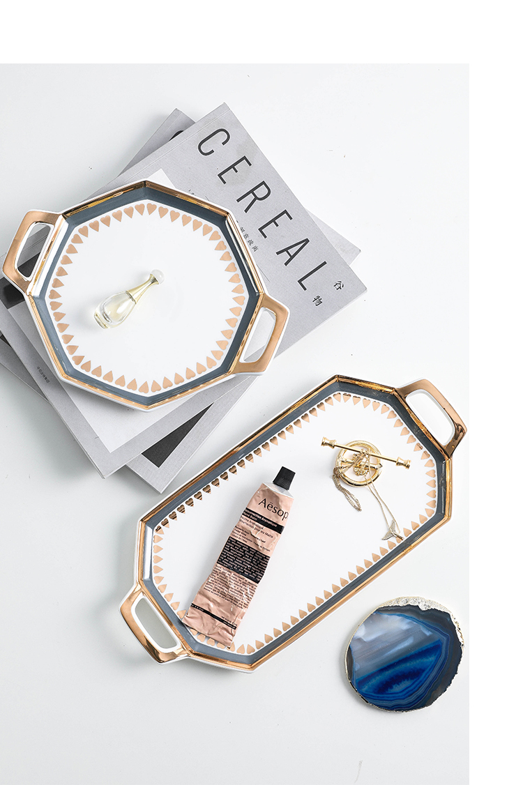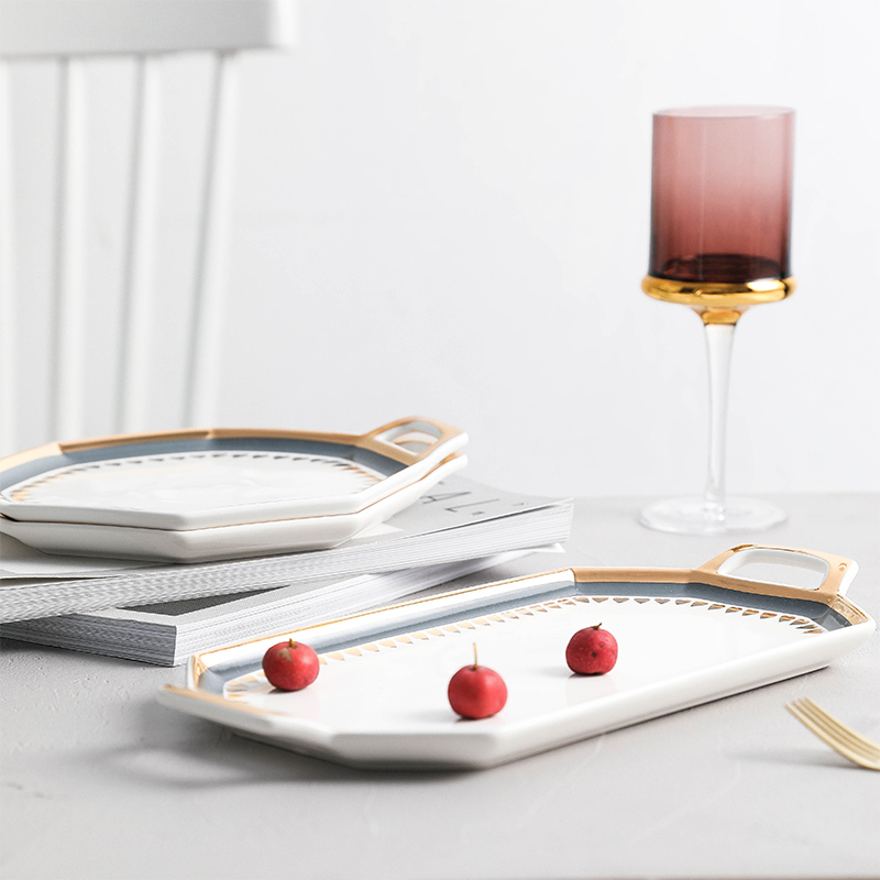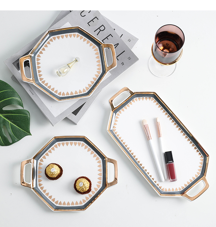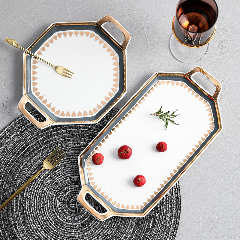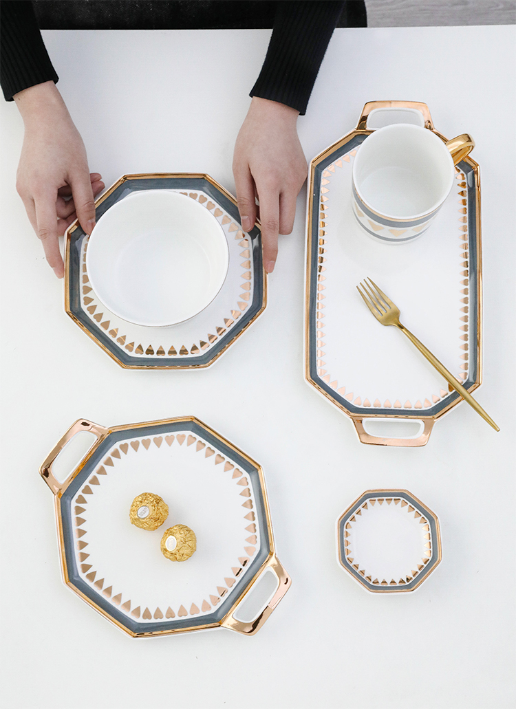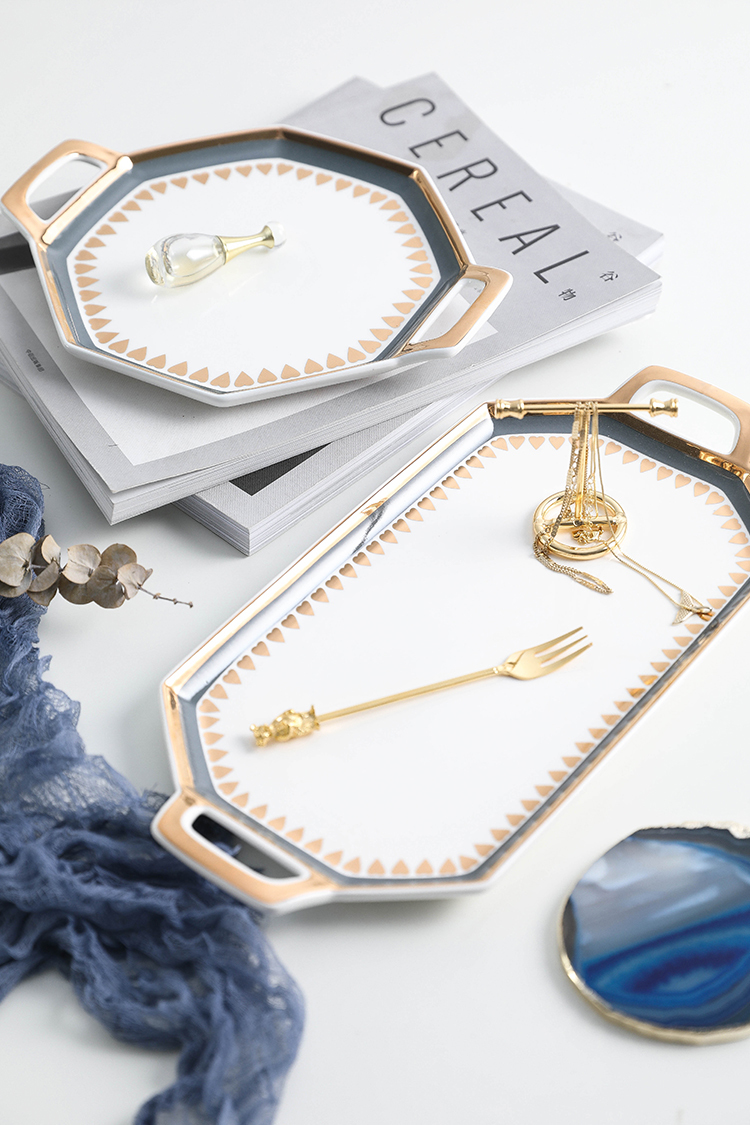 輕奢風的陶瓷盤,有加寬金邊描繪,搭配灰紋金色愛心的創意花紋。