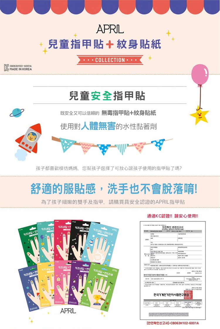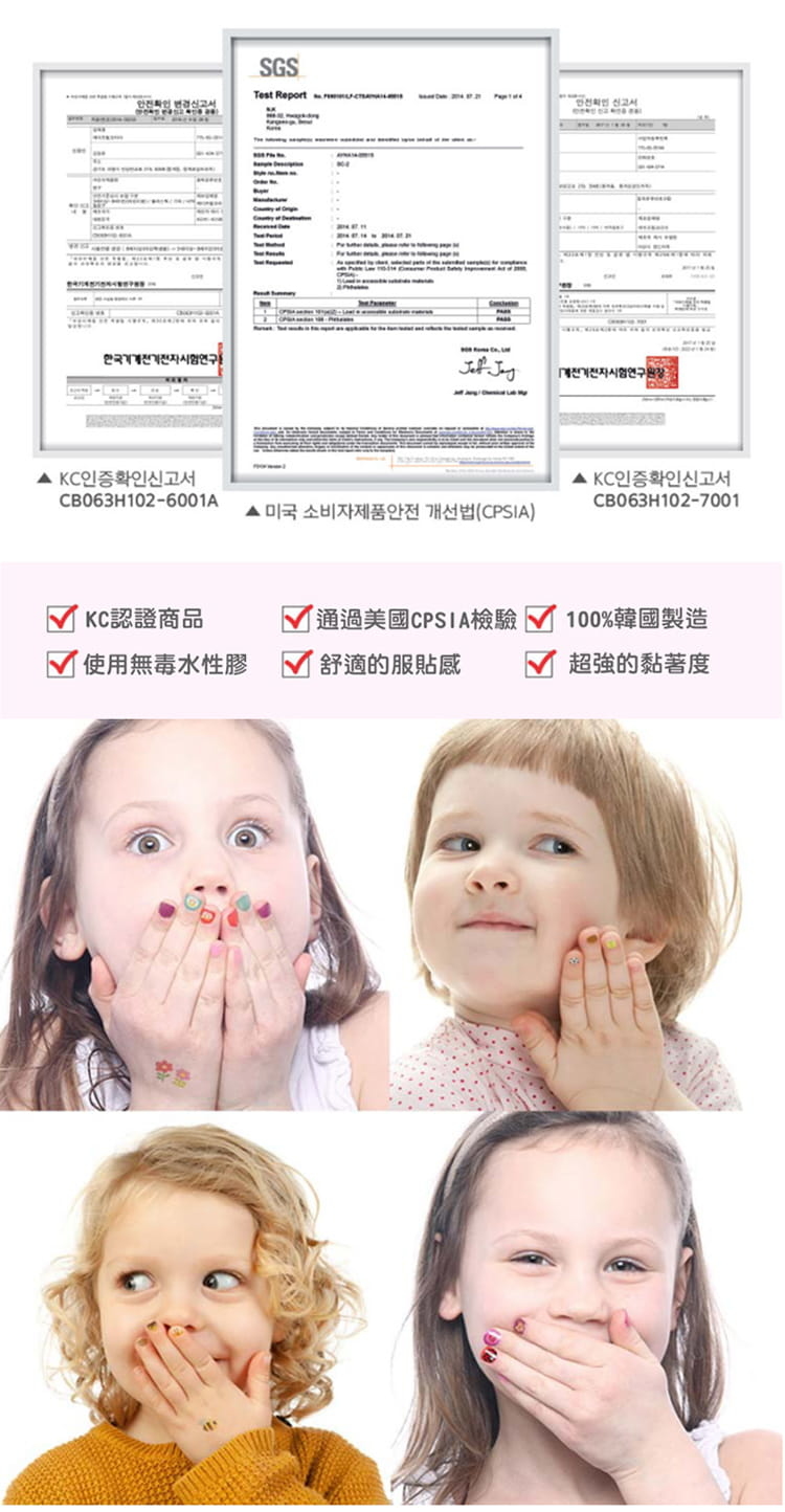 ✱ 韓國KC安全認證✱ 通過美國CPSIA檢驗✱ 100%韓國製造安全又可愛✱ 舒適的服貼感✱ 超強黏著度及持久度高,一貼就能維持很久✱ 使用對人體無害的水性黏著劑✱ 三歲以上的幼兒及兒童都可以安全使用✱ 洗手流汗都不會脫落