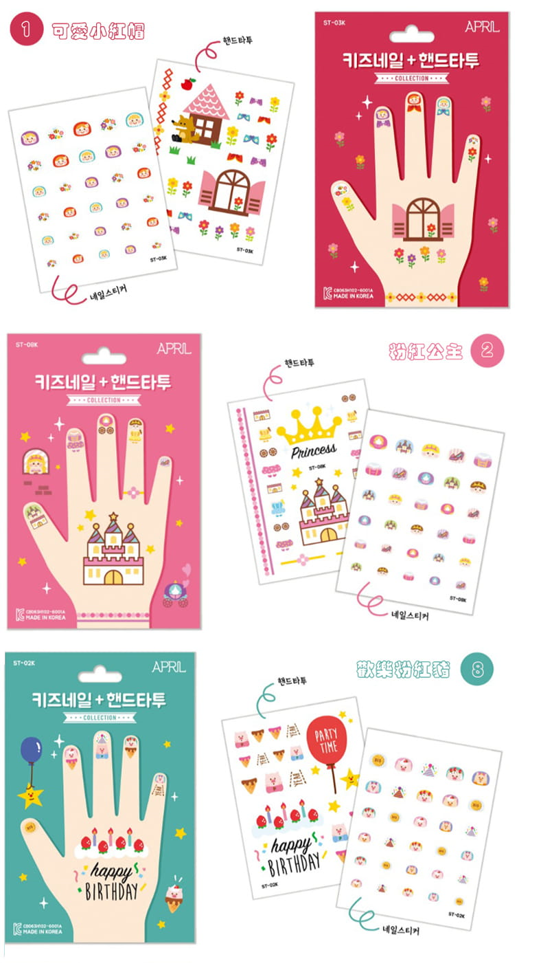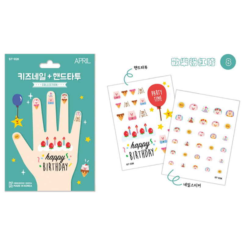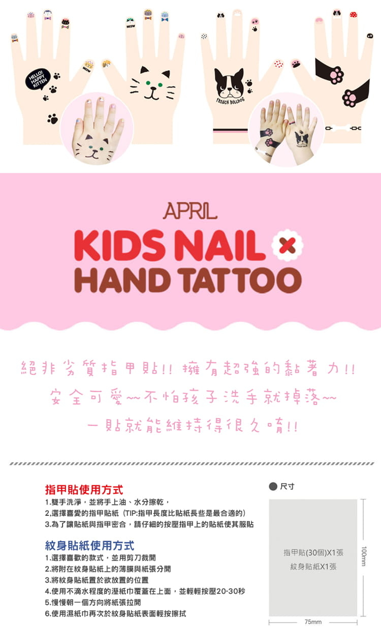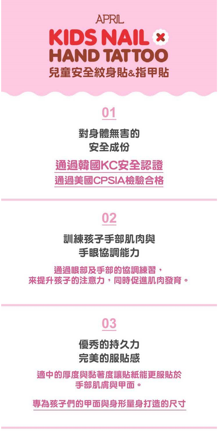 指甲貼+紋身貼紙 — 歡樂粉紅豬[指甲貼建議使用方法]1. 清潔甲面並擦去水分及油脂,讓指甲貼更服貼2. 請選擇比指甲 <小一尺寸> 的貼紙3. 貼上貼紙並輕輕按壓三秒鐘即完成![紋身貼紙建議使用方法]1. 選擇喜歡的款式,並用剪刀裁開2. 將喜歡的紋身貼紙置於欲放置的地方3. 使用水或濕紙巾覆蓋在放面,並輕輕按壓20-30秒4. 慢慢將紙張朝同一個方向拉開即完成![保存方法] 置於陰涼處[保存期限] 無保存期限『韓國APRIL安全無毒兒童指甲貼+紋身貼紙』韓國製造孩子都喜歡模仿媽媽,但您真的幫孩子選擇了可放心使用的指甲貼嗎?