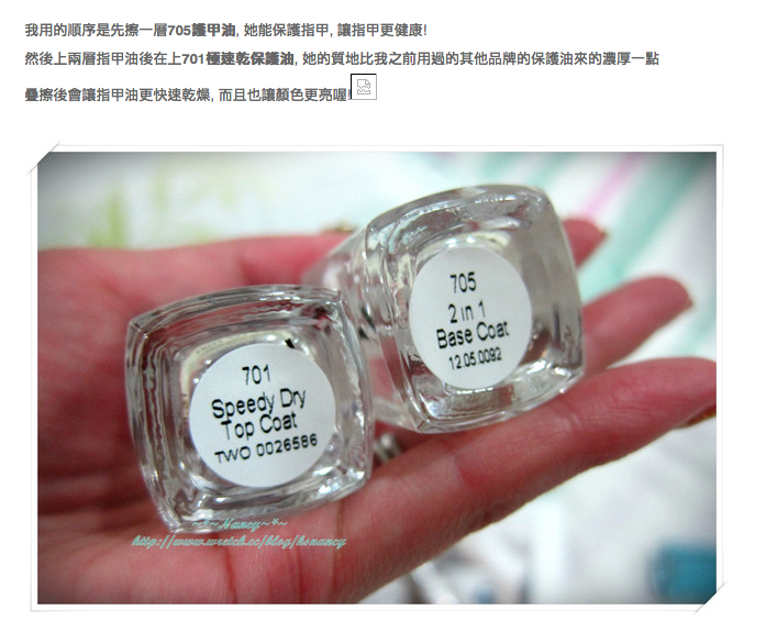 另外建議以此705為底層,701 速乾亮光保護油做為最上層保護,701不僅有能避免指甲油脫色,更能增它的光澤感