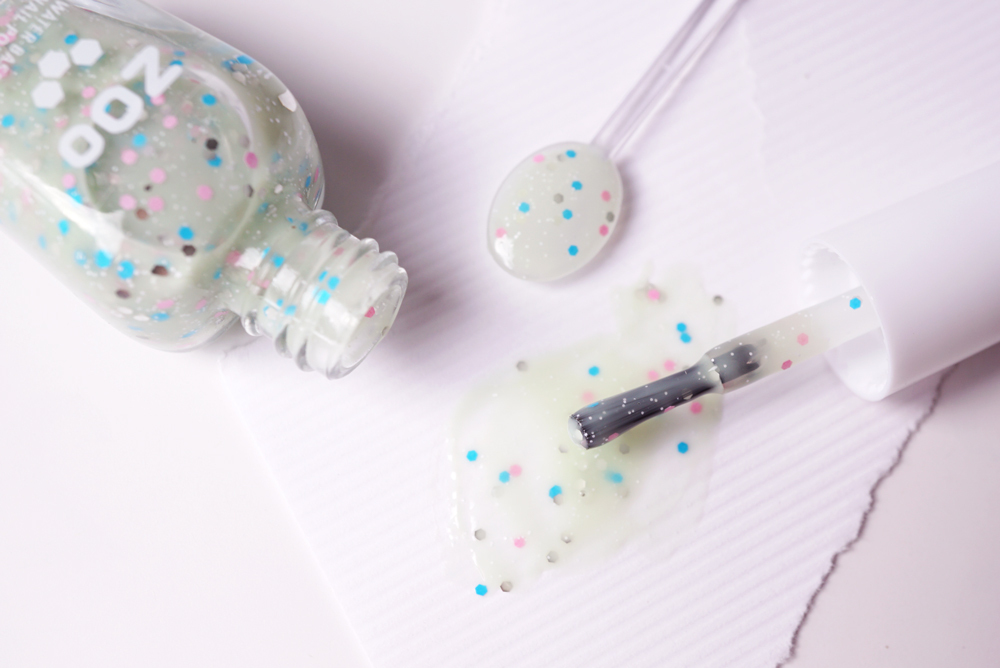 清透果漾綠的指甲油中,有閃閃發亮的粉色,藍色系亮粉