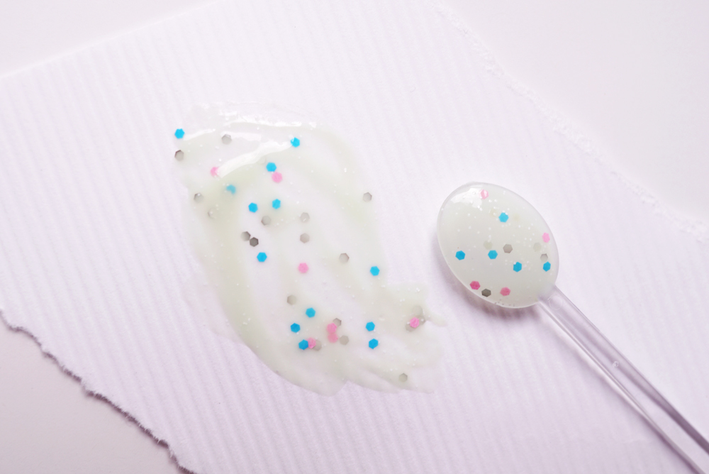 2.側面顏色對應此瓶顏色,還有代表亮片的圖案點綴,有圓點也有線條,代表亮片的繽紛顏色。